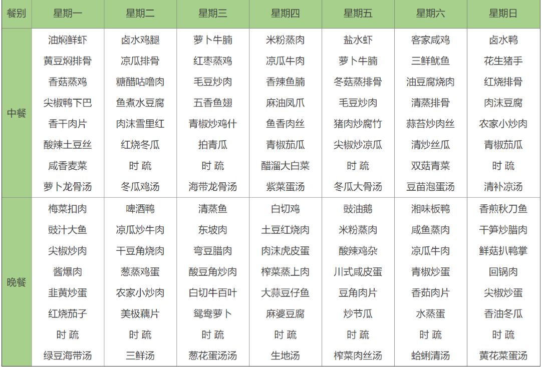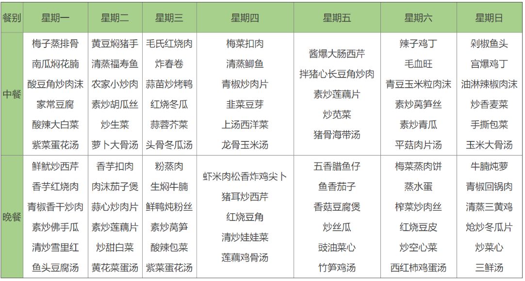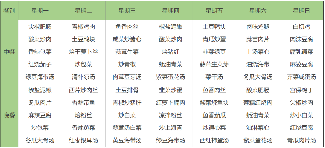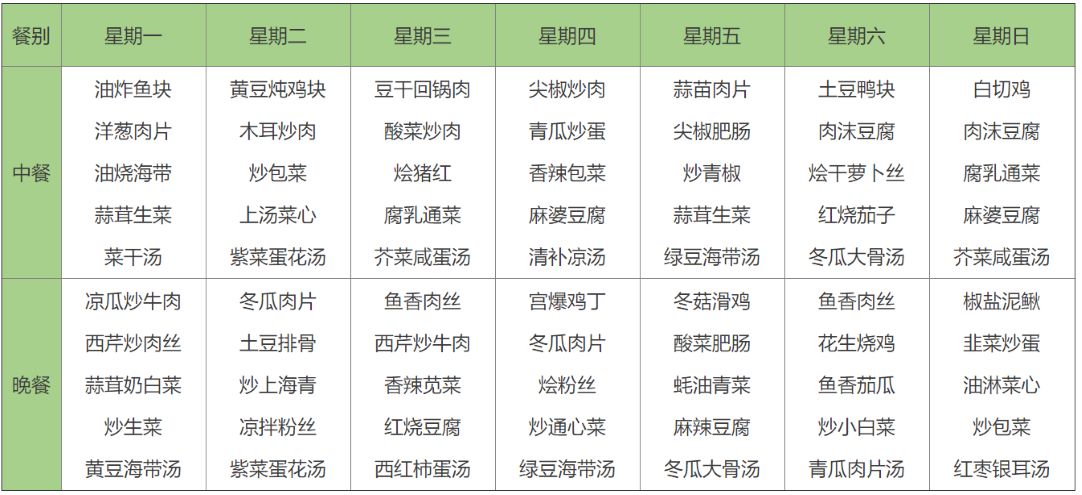 十四元菜譜?(中、晚餐各7元/人/餐,兩葷一素,菜量足夠,米飯例湯任吃,每周不同,每天十四元)